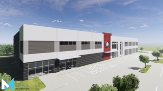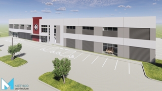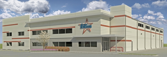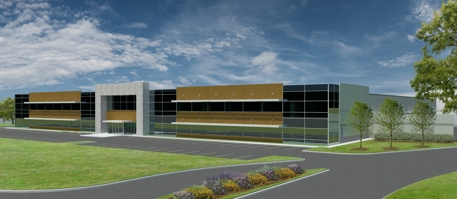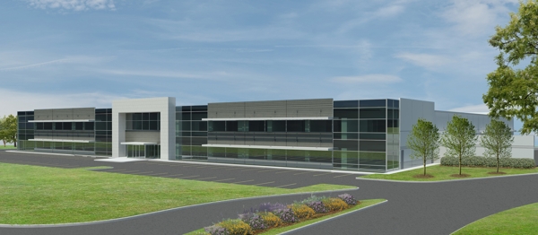 Three Square Design Group, this two-story building will be situated on a 14-acre tract of land and consist of 108,921 SF of floor space. The design will feature a two-story open lobby with office space and retail section for product display. As depicted in the artist’s rendering below, the front elevation consists of 2-story curtain wall glazing and stained concrete panels with a wood plank-type formliner, as well as louvered sunscreen canopies. A stone veneer will surround the front entrance. The expected date of completion is first quarter 2015.