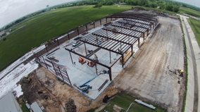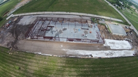 (4-14-16) These aerial pictures were taken today at Superior Tank showing the steel erection progress after 3.5 days. Lime stabilization of the paving is currently underway, and we are working to get the first section of paving down on the North and West sides of the building shortly thereafter. Check back often ... it's full speed ahead now!