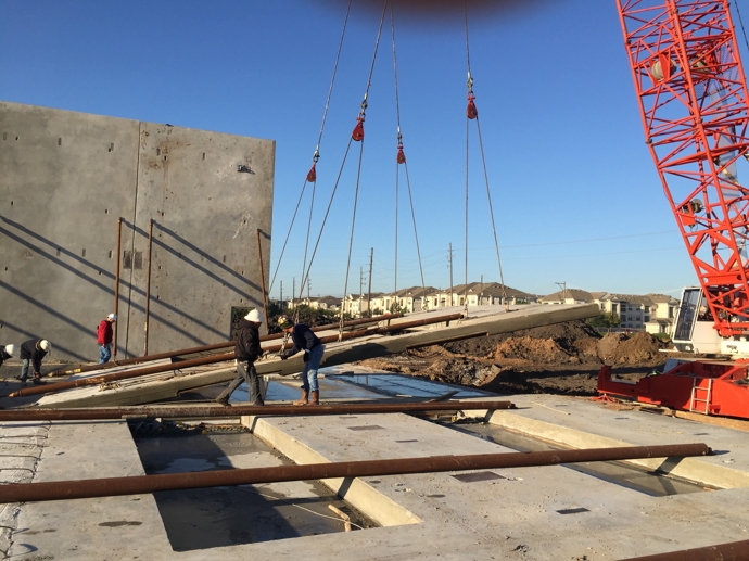 Erecting tilt-wall panels is an amazing procedure. Here are some photos showing the process. NOTE: This project won a 2015 TCA Tilt-Up Achievement Award. Check out the details HERE. (Click on photograph below for a drone's eye view of the panels!)