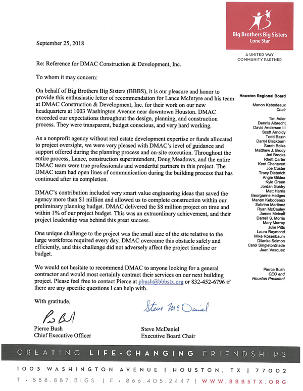 The new building features a mentoring hall of fame to celebrate the power of one-to-one friendships, cafe for Bigs and Littles to plug in or play a game and connect with fellow volunteers and staff, interview and children play rooms, 2nd floor private office space, and a 7,000 sq. ft third floor event space with an outdoor terrace overlooking the downtown Houston skyline!