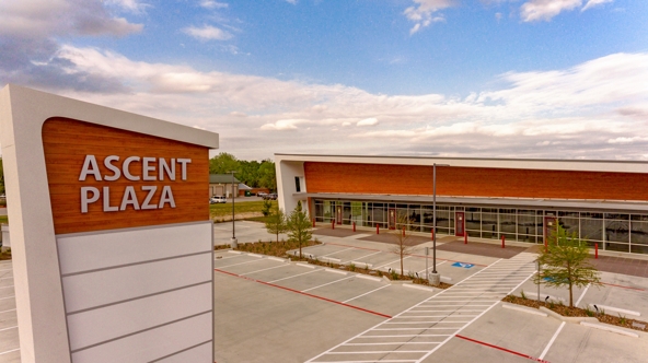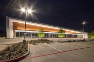 On a busy, rural road in Cypress, sits an amazing structure known as Ascent Plaza. Recently completed by Dmac, this 10,369 square foot building, with approximately 20,100 square feet of parking, is unlike any other structure in that area. Its steep-sloping, high roof, accented with a façade of Alumaboard (a wood-look metal siding), outlined with LED strip lighting on the front of the building, is a unique architectural feature and really makes the building stand out after dark, as pictured here.